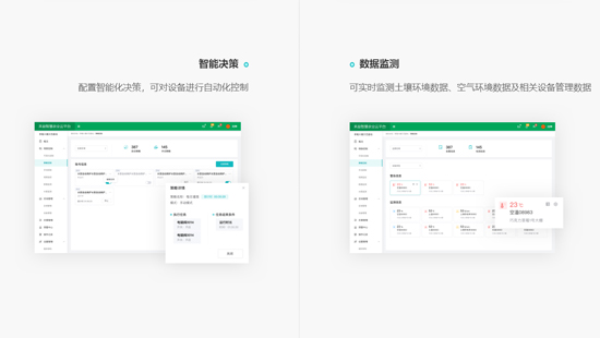 2020年公司專注于智慧農(nóng)業(yè)關(guān)鍵技術(shù)研發(fā),積極探索重慶智慧農(nóng)業(yè)發(fā)展新方向。先后服務(wù)酉陽(yáng)、石柱、南川、北碚等區(qū)域客戶智慧農(nóng)業(yè)云平臺(tái)建設(shè),受到業(yè)主一致好評(píng)。公司始終堅(jiān)持“產(chǎn)品+數(shù)據(jù)+技術(shù)+服務(wù)”的發(fā)展模式,致力于智慧農(nóng)業(yè)整體解決方案研發(fā)和服務(wù)。通過(guò)數(shù)據(jù)和技術(shù)雙輪驅(qū)動(dòng),實(shí)現(xiàn)農(nóng)業(yè)規(guī)模化、精準(zhǔn)化、智能化。